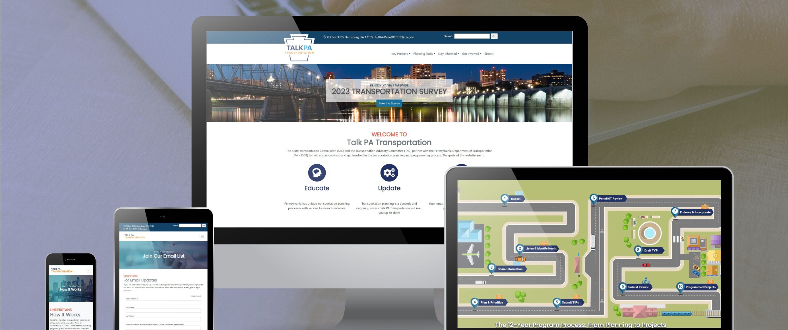 McCormick Taylor developed a plan to harness new technology and innovation to provide a more convenient and accessible method to participate in transportation planning on a statewide basis. The plan continues to evolve with each cycle, and currently includes the following innovative communications tools and techniques: a new, modernized website; a customized online and printable survey; a live Online Public Forum broadcast featuring English and Spanish captioning, American Sign Language (ASL) interpretation, and an audio-only option; animated educational infographics; consistent, engaging social media content generation; interactive web maps; and a collaborative plan that brought together all key stakeholders in the process.
