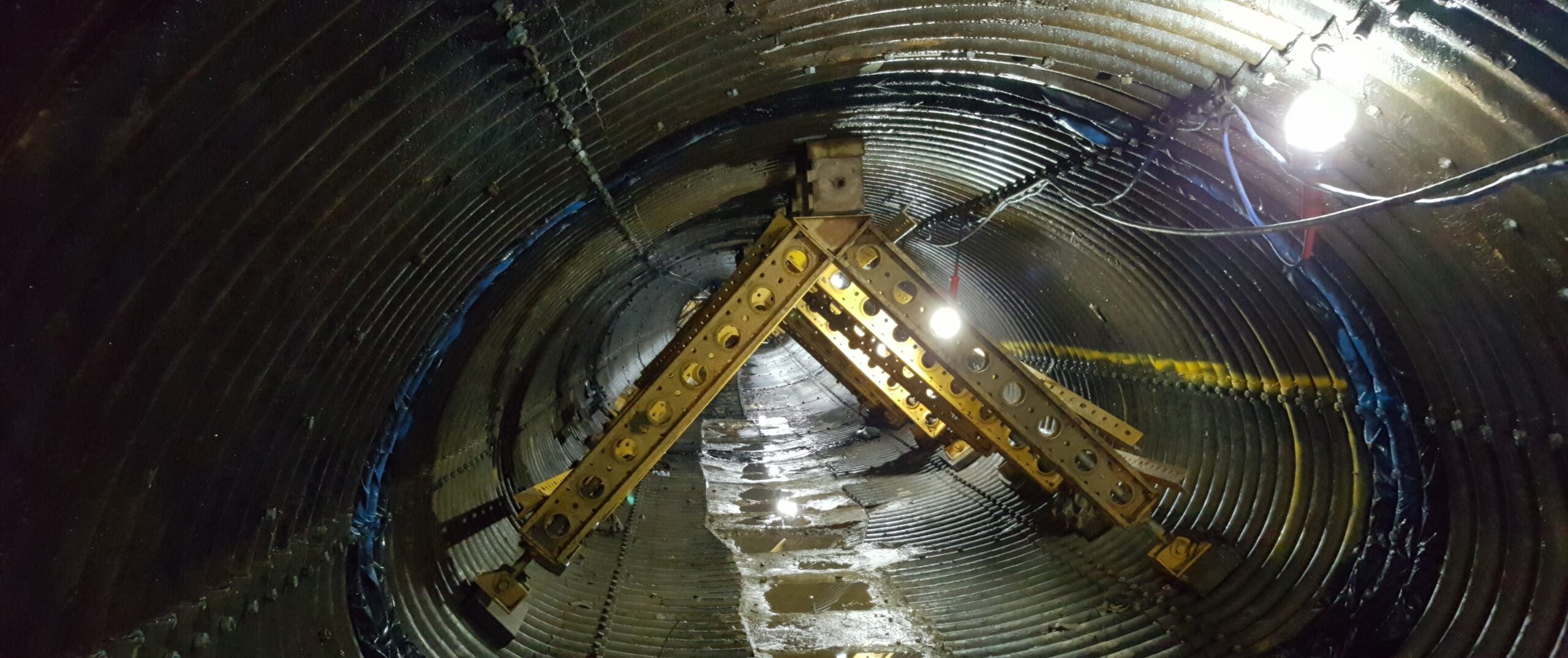 In coordination with our subconsultant, KMA Consulting Engineers, LLC, McCormick Taylor performed geotechnical investigations and developed an innovative solution that we used successfully several years earlier on twin culverts measuring 9 feet, 10 inches high and 14 feet, 2 inches wide at GSP MP 118.5. The repair procedure, taken from the tunneling industry, involves the use of steel ribs and steel-reinforced shotcrete. The overall deformity of the culvert, in addition to the specific areas of failure, resulted in constantly varying interior geometry. A 3-D laser survey was performed of the culvert to obtain exact interior dimensions for design of the steel ribs.