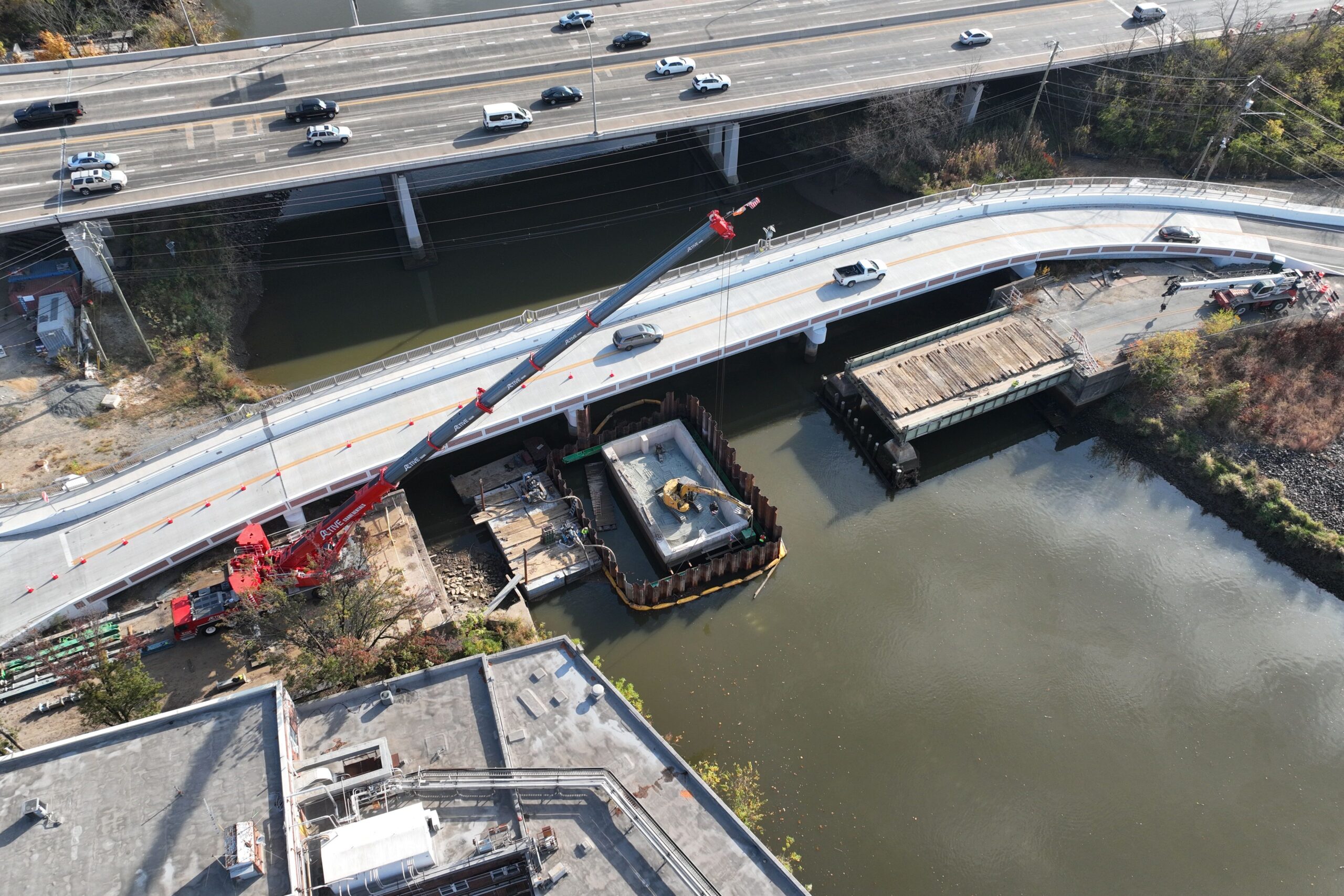 - The slightly off-alignment bridge design allowed the existing bridge to remain open during construction providing truck access to the industrial park.