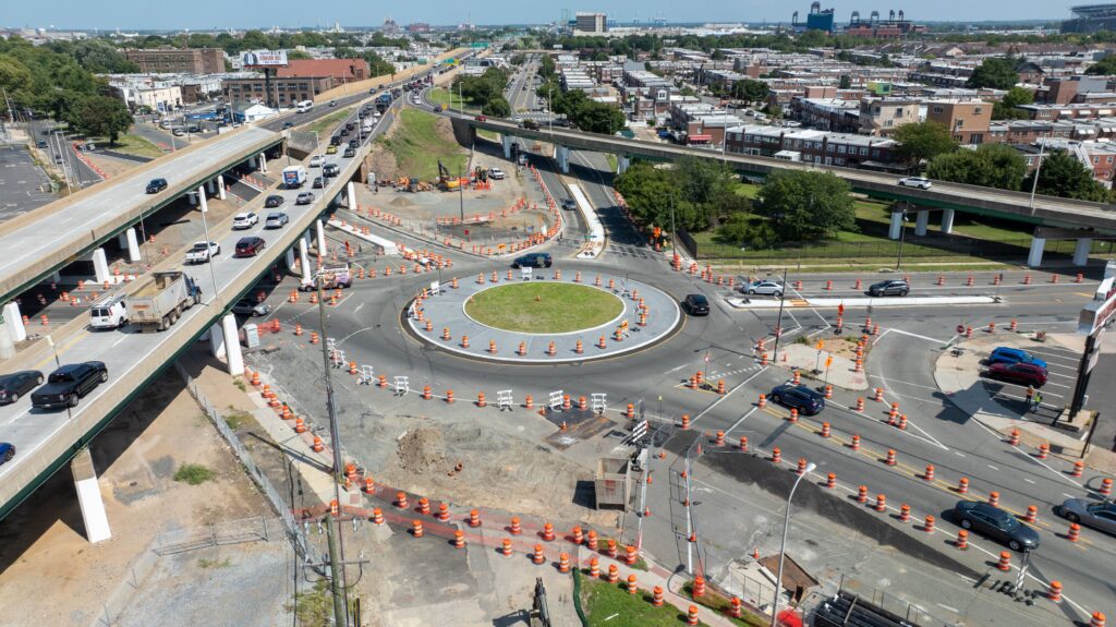 Construction of the Penrose Roundabout commenced in April 2024 under a $5.8 million contract funded by PennDOT’s Automated Red-Light Enforcement (ARLE) program. At the start of construction, the existing traffic signal was removed, and a temporary roundabout was installed. The contractor proceeded to build the roundabout in pieces while keeping the intersection open to cars and SEPTA buses, starting with the center island. The completion of the Penrose Roundabout was officially marked by a community walk-through and a flag-raising ceremony on June, 24, 2025.