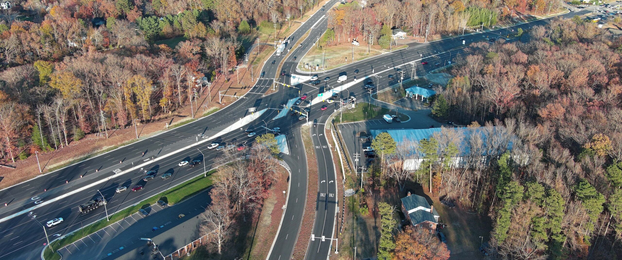 A four-lane divided highway serving nearly 44,400 vehicles daily, State Route 10 is a crucial Chesterfield County transportation link, providing the area’s only connection to I-95 and I-295. Serving a mixture of residential, commercial, and industrial development, the corridor has experienced rapid traffic growth. With many local business developments, including several distribution centers, State Route 10 is an important truck route. This project added capacity along the corridor for large-scale developments and a proposed technology center to meet expected traffic volume exceeding 105,000 vehicles daily by 2036. Choosing this innovative Superstreet intersection design eliminates thru and left-turn movements of the minor cross-streets, which reduces signal phases and increases major movement efficiency and flow.