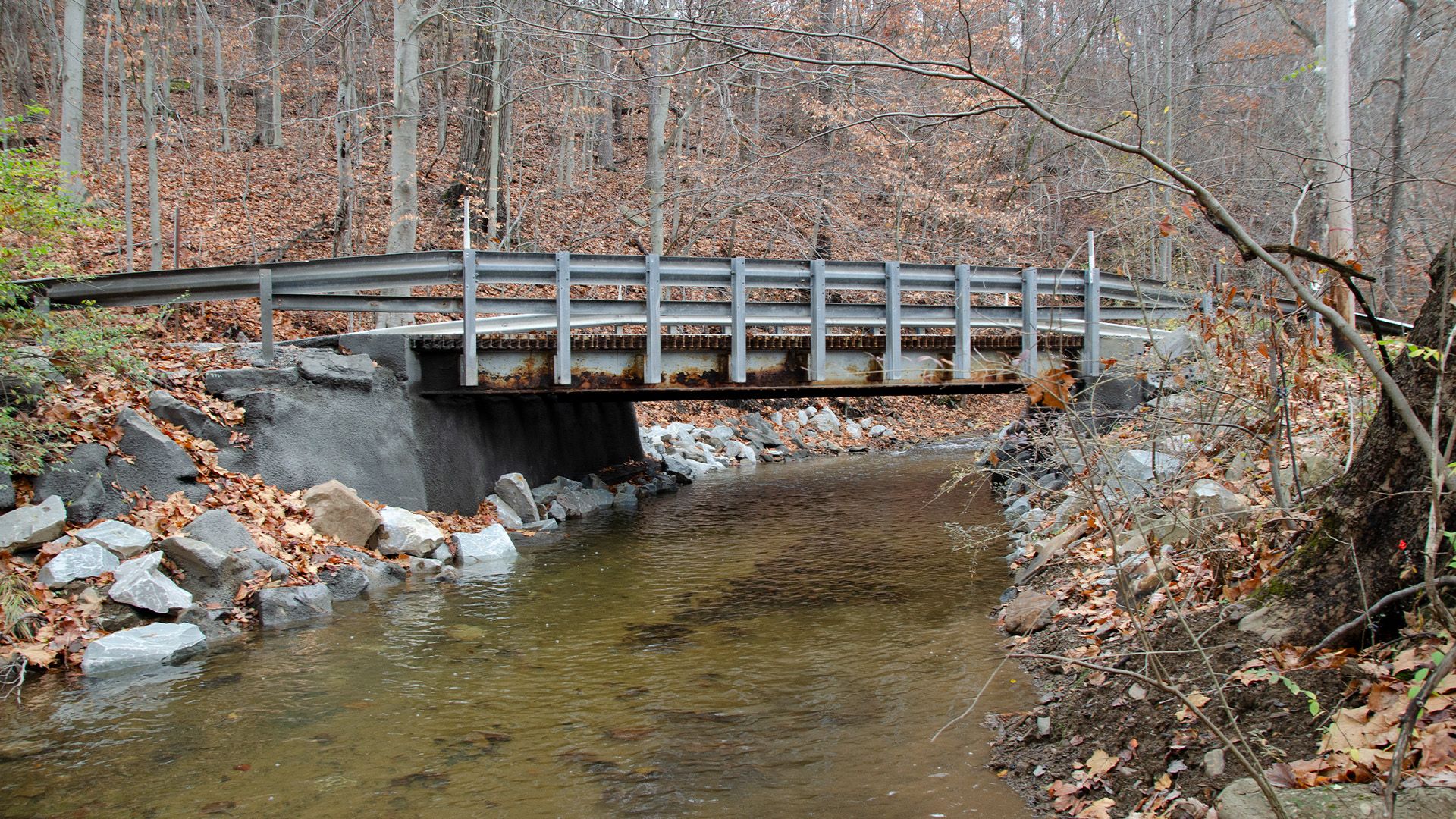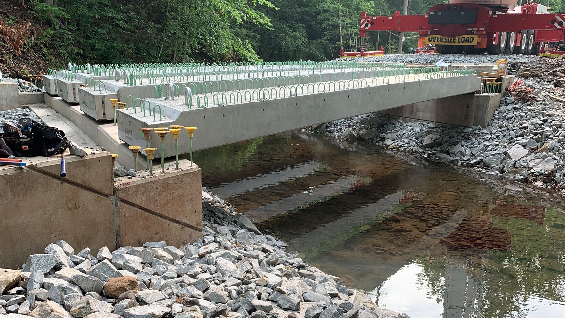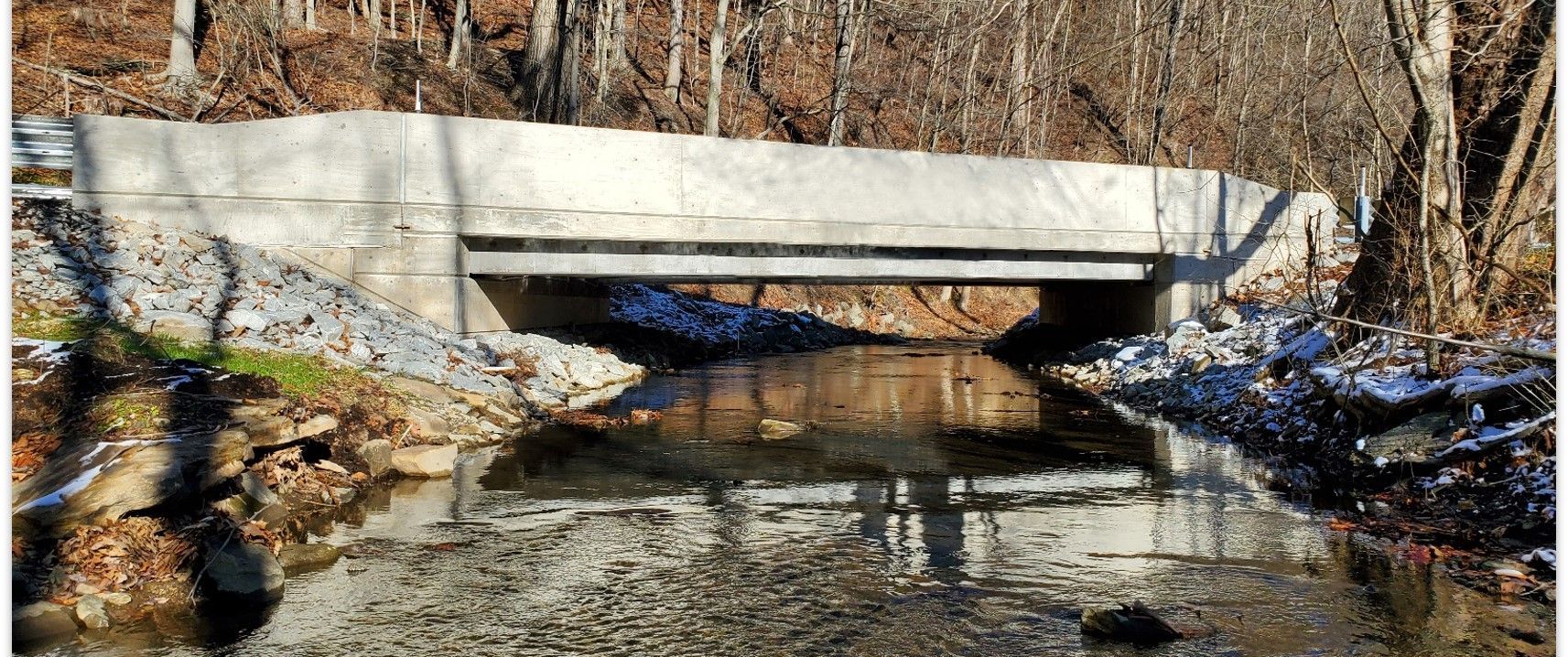 - The new 17 inch deep spread box beams and 8 inch composite concrete deck required lowering the low chord to maintain the roadway profile limiting the approach roadway reconstruction length and related impacts. To avoid stream impacts due to the lowering of the low chord, the span length of the structure was increased.